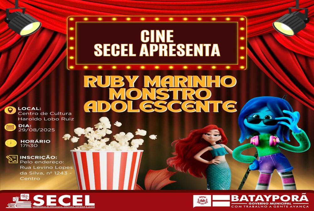 A Secretaria Municipal de Educação, Cultura, Esporte e Lazer (Secel) promove mais uma edição do Cine Secel nesta sexta-feira (29), em Batayporã. O público poderá conferir gratuitamente a animação “Ruby Marinho – Monstro Adolescente”, em sessão marcada para às 17h30, no Centro de Cultura Haroldo Lobo Ruiz.